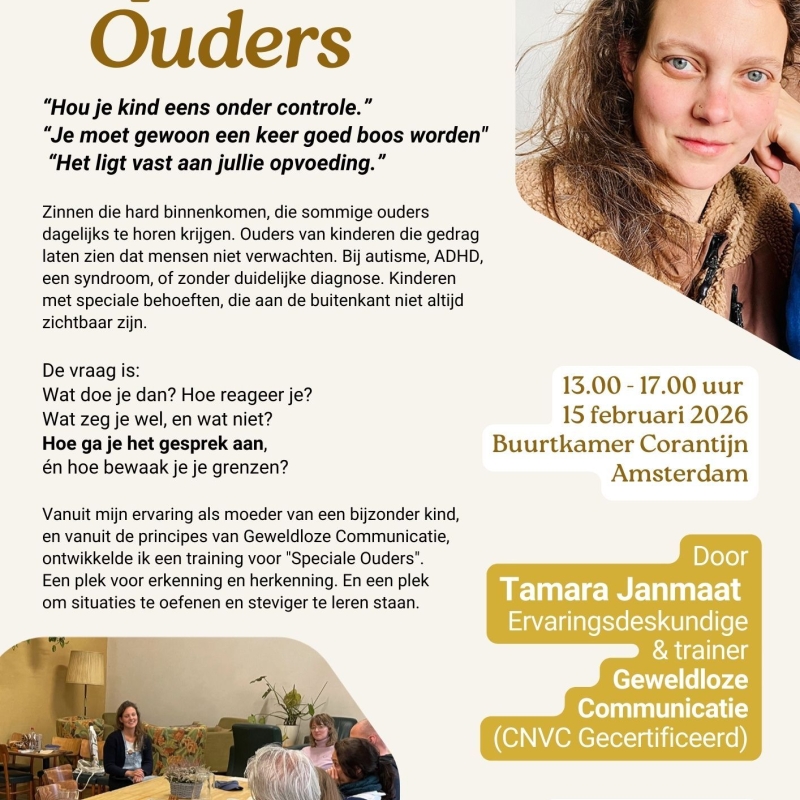 Vanuit mijn ervaring als moeder van een bijzonder kind, en vanuit de principes van Geweldloze Communicatie, ontwikkelde ik een training voor "Speciale Ouders". Een plek voor erkenning en herkenning. En een plek om situaties te oefenen en steviger te leren staan.